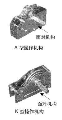 A型操作机构直接安装于开关本体上,是双弹簧储能手动操作机构,其操作原理及操作方向为:(面对机构)首先顺时针旋转使其分闸弹簧储能,并被闩销锁住;然后逆时针旋转使开关合闸;再顺时针旋转,闩销被打开,分闸弹簧释放,带动开关分闸;继续顺时针旋转,又为下一次分闸储能。即,在开关合闸后,分闸弹簧已经储能完毕。此时,用下述四种方法均可使其分闸,即:手动;电动操作机构;并联跳闸线圈;熔断器跳闸机构。